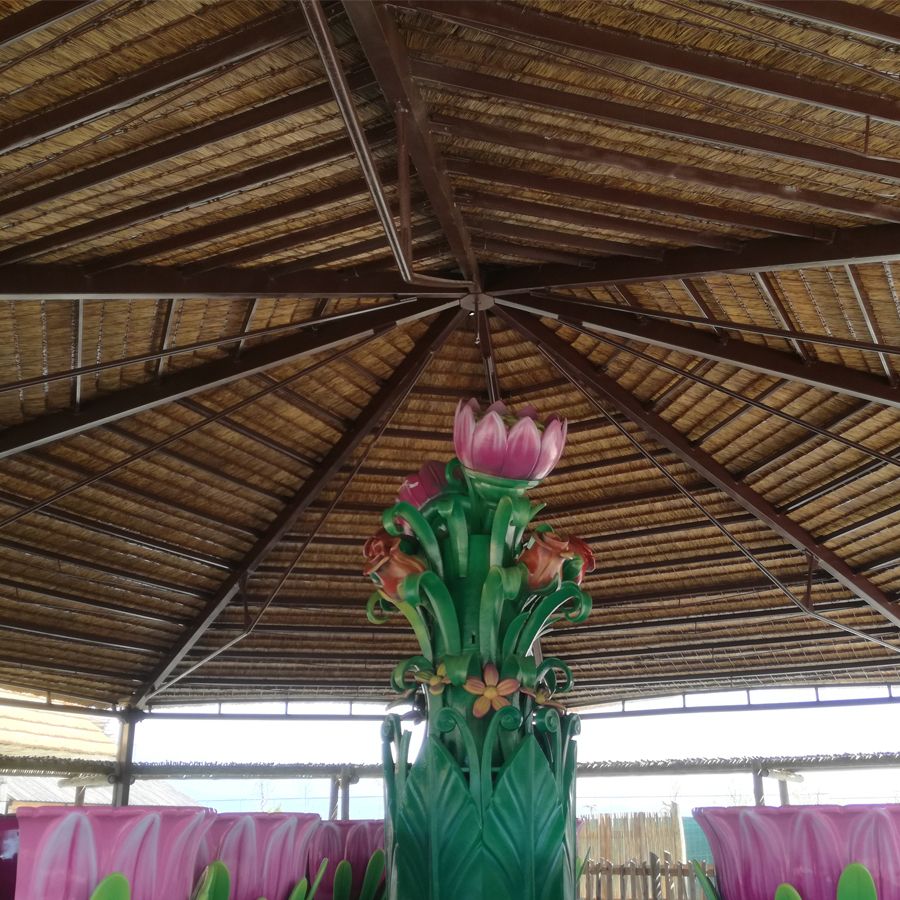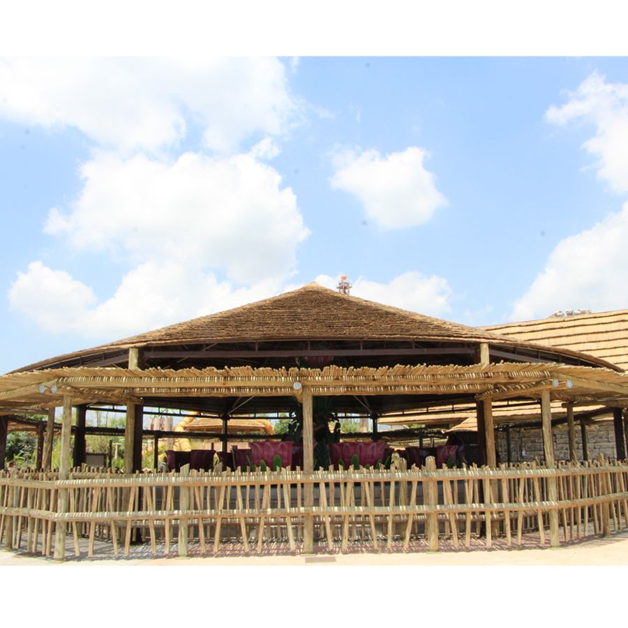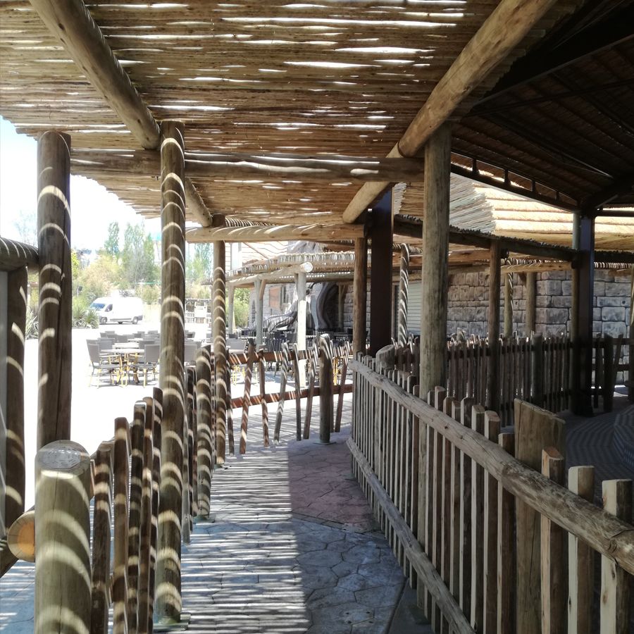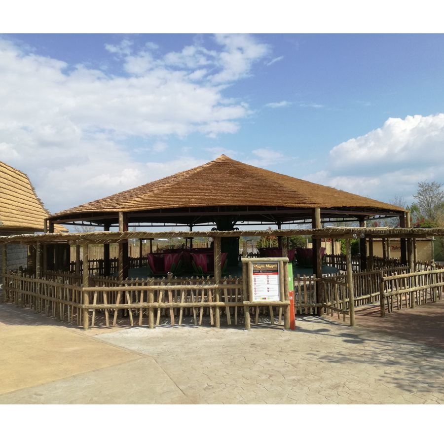 Rifacimento dell’area adiacente alla giostra con una nuova copertura, capanne perimetrali in Eucalipto sudafricano FSC e le recinzioni su misura in Eucalipto sudafricano FSC. La nuova copertura è stata installata su una struttura metallica già e esistente e modificata in loco. La copertura è impermeabile grazie al sistema "doppia Tegola " di AFRICA STYLE, che con delle tegole classiche in Canna del Capo naturali ed un passo ridotto riesce a garantire fino al 98 % di resistenza all'acqua, evitando pellicole plastiche nel mezzo e quindi garantendo la durata del materiale naturale.